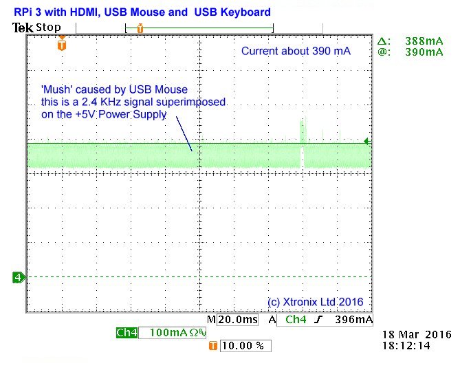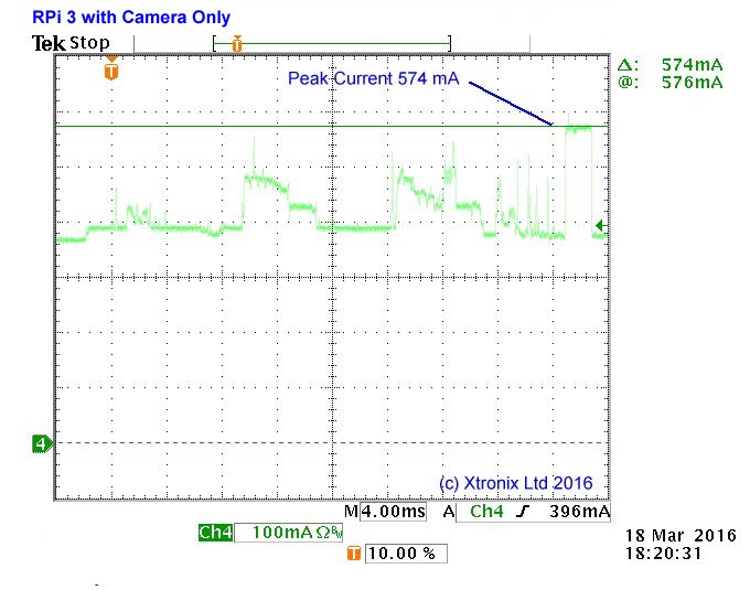 The above figures are 'typical. They are measured on one example of each configuration using a Tektronix Digital oscilloscope with a Tektronix current probe. The operating system on each PCB (except the RPi 3 Model B+) was Raspian from NOOBS 1.8. Raspian GNU/LINUX 9 was running on the RPi 3 Model B+.